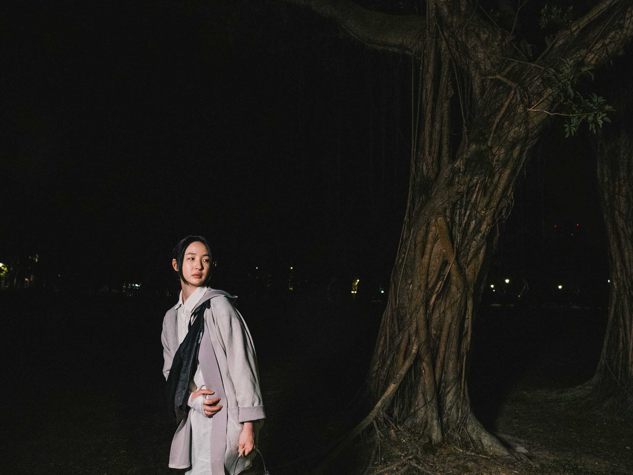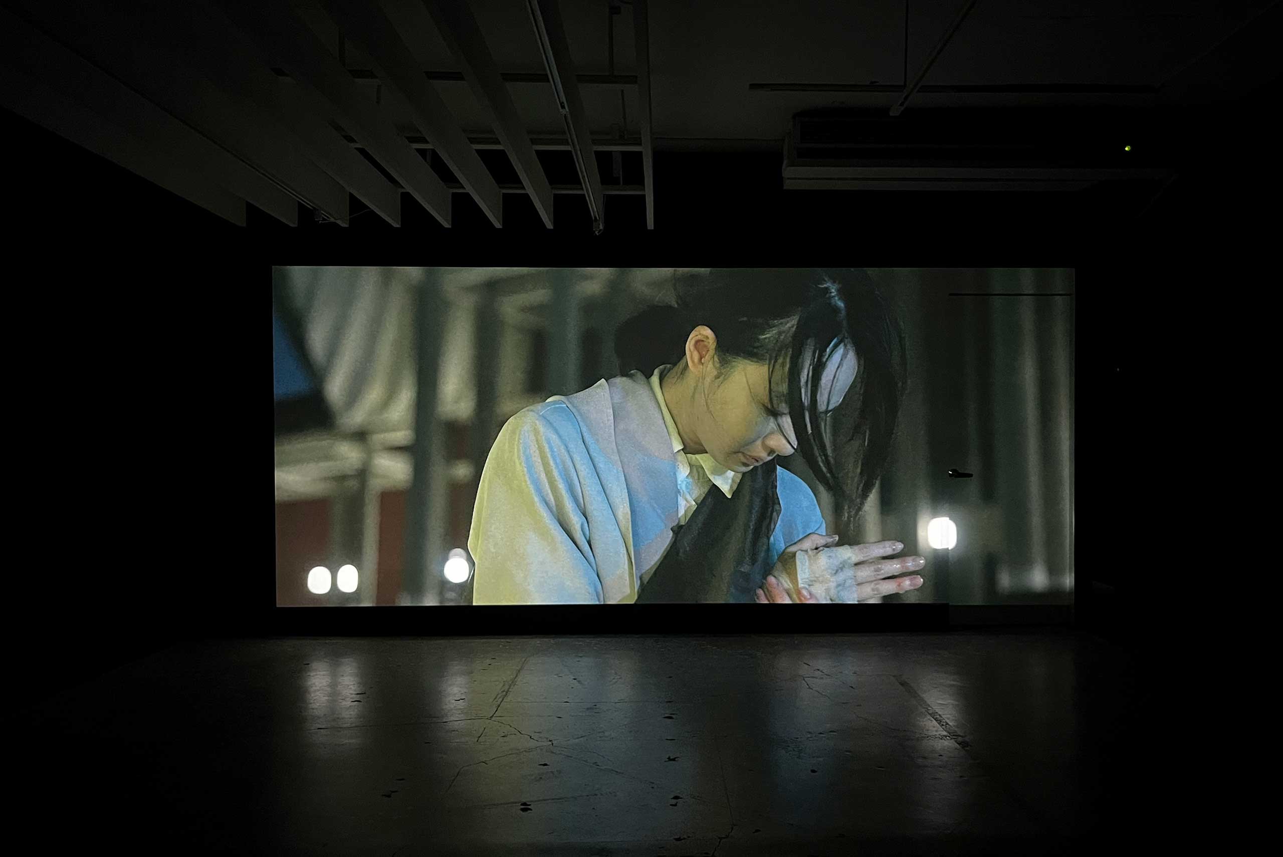 Building on Candy Bird’s previous works “All the best,” (2023 Green Island Human Rights Art Festival) and “Riverside Fireworks” (Hiroshima Motomachi Art Festival), the artist continues to explore sensibility and political undertones drawn from memory. These inquiries have become key points of departure in his creative practice. By closely examining the self, Candy Bird constructs narratives that investigate the notion of “gaps”—spaces of dislocation and ambiguity—used to reflect the complex realities of contemporary East Asian societies. This process also represents an attempt to reconcile inner contradictions. “Unnamed Nightshade” was initially inspired by the Taiwanese folk tale of “Tiger Aunt” and the artist’s personal experience of authoritarian-style education in the past. The work was filmed in the environment where Candy Bird grew up. In the video, an enigmatic figure wanders through a pitch-dark plaza, where the looming, monumental architecture in the background echoes a condition of speechlessness. Through this work, the artist invites viewers to sense the presence of a force overshadowing the individual—and to ask what that force might be.